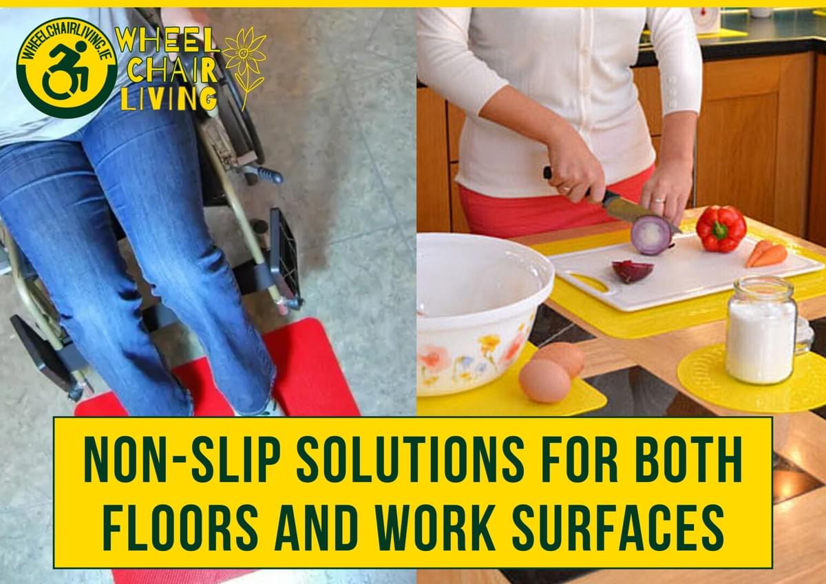 Ensure home safety by using rubber mats in high-moisture areas for stable wheelchair transfers. Complement this by lining counters with silicone matting or Dycem reels to grip items like bowls and keyboards, preventing them from sliding while you work.