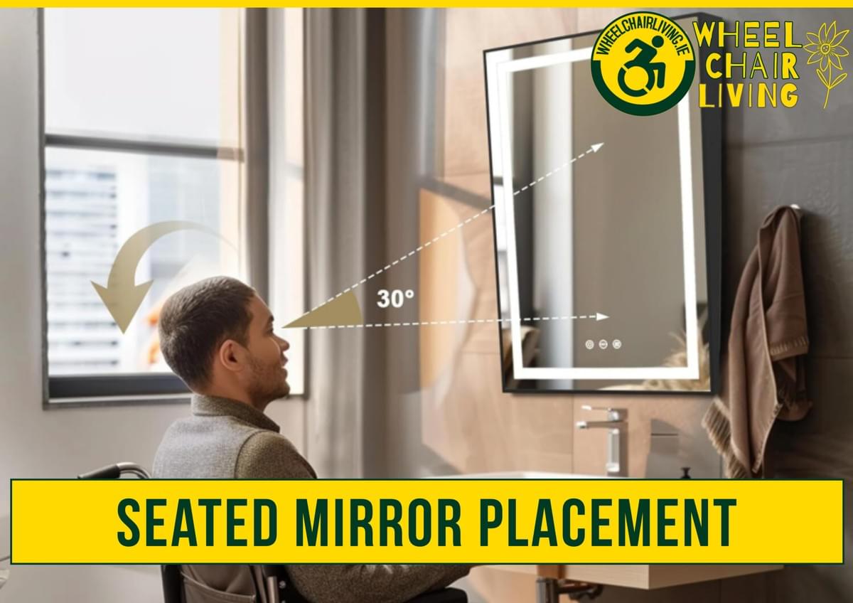 Lower bathroom mirrors or install tilted vanity mirrors to ensure full visibility from a seated position. Angling the glass downward or choosing a pull-out accordion style allows you to see clearly for grooming without needing to stand or strain your neck.