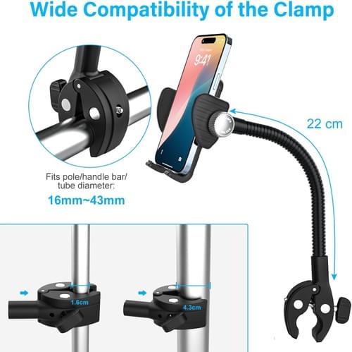 • Universal & Versatile – Easily attach your phone or small device to most handlebars, poles, or tubes (16–43mm diameter). Perfect for wheelchairs, walkers, hospital beds, prams, treadmills, spin bikes, shopping carts, boats, golf carts, railings, and more.